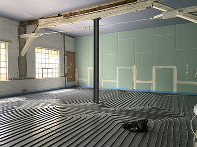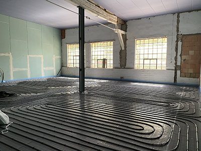 Die frisch verlegten Fußbodenheizungsschleifen im Atelier des Kühlschiffs. |