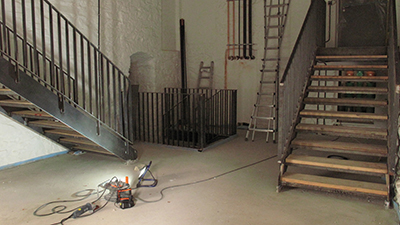 Treppe und Tür zum Dachgeschoss des Brauhauses. Um den Treppenzugang herzustellen, musste die Decke über dem großen Saal parziell geöffnet werden. Von der zweiten Treppenstufe sieht man daher nun temporär hinunter in den Saal. |