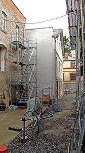 Endreinigung der Sonthofener Fußbodenplatten im Getreidelager OG. Auf der Terrasse über dem Getreidelager: Putz- und Malerarbeiten an der Fassade des Südflügels. |