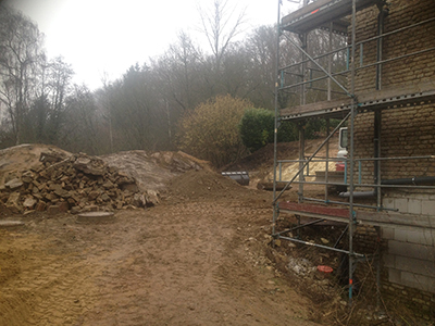 30.01.2020 Fertigbetonteile zur Abstützung der Terrasse im Bereich des Pferdestalls, schichtweise Aufschüttung und Verdichtung mit Erdmaterial. |