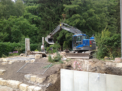"Schlachtfeld" mit Aushub im Garten des Pferdestalls nach dem erneuten Ausgraben der bereits gesetzten aber abgesackten Betonstützmauerelemente. | |