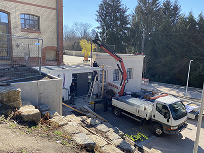 01.03.2021 Die Stahlbrücke zur Entfluchtung der Terrasse des Getreidelagers wird angeliefert und montiert. |