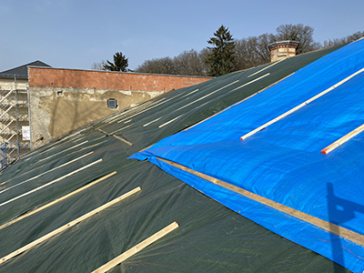 Das abgedeckte und provisorisch gesicherte Dach des Kühlschiffs ... |