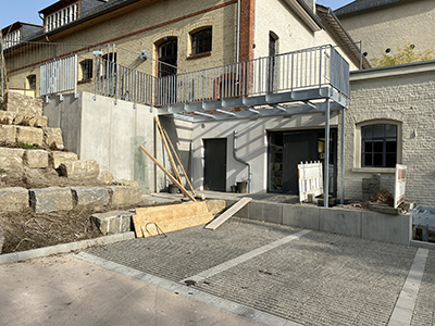 Die Beton-L-Profile der Hangbefestigung am Haus Esch muß rückgebaut bzw. versetzt werden. Sie stand teilweise auf der Fläche zweier geplanter Parkplätze und damit an der falschen Position. |