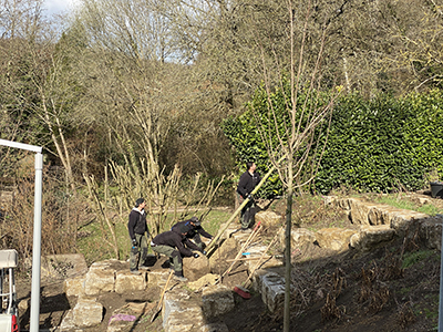Ein neuer Ahorn wird am Hang unterhalb des Pferdestalls gepflanzt. |