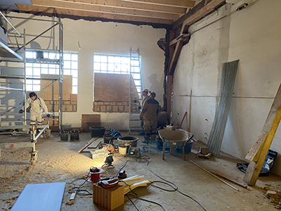 Links: Der noch verschlossene Durchgang zwischen großem Saal und Brauhaus. Rechts: Improvisierte Sitzecke für Pause der Trockenbauer. |