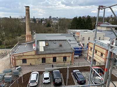 19.04.2021 Blicke vom Neubau auf das Kernensemble der Walkmühle. |