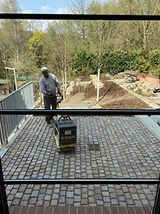 21.04.2021 Verdichtung des Pflasters auf der kleinen Terrasse des Pferdestalls. |