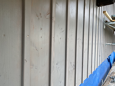 Blick auf das "Vinotto" und Holzverkleidung der östlichen Giebelfassade des Kühlschiffs. |