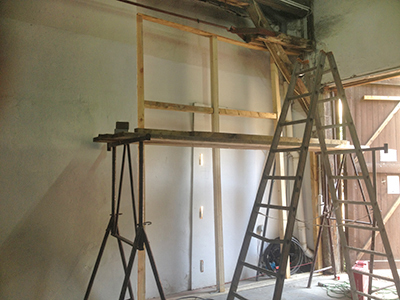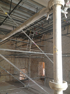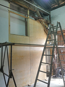 15.08.2018 Aufbau einer provisorischen Zwischenwand zwischen Kühlschiff und dem abgebrochenen Vorbau des Brauhauses. |
