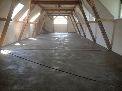 04.09.2018 Der Estrich im künftigen Gemeinschaftsatelier im Dachgeschoss des Pferdestalles wird gegossen und bedeckt die Heizschleifen der Fußbodenheizung. |