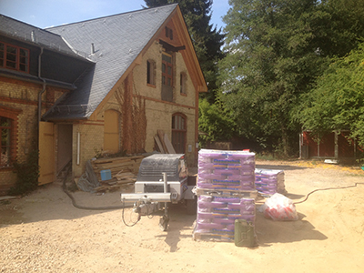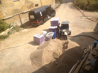Zubereitung des Fußboden-Estrichs vor dem Pferdestall. Von hier aus wird der vorbereitete Estrich in das Dachgeschoss des Pferdestalles und des Südflügels (unten) gepumpt. |