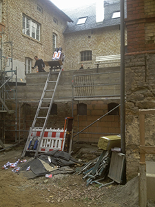 05.11.2018 Der Abbruch der Bodenplatte und des alten Sockels unter der Treppe im vorderen Bereich des Pferdestalls. Der Übergang zum restlichen Teil des Bildhauerateliers von Christiane Erdmann ist provisorisch abgedichtet. |