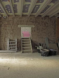 Im Treppenhaus selbst wird derweil eine erste Putzschicht aufgetragen, bevor die Geschossdecke später entfernt wird. Noch führen die Türen aus Malzhaus (links) und Südflügel (rechts) teilweise ins "Nichts". | ||