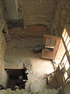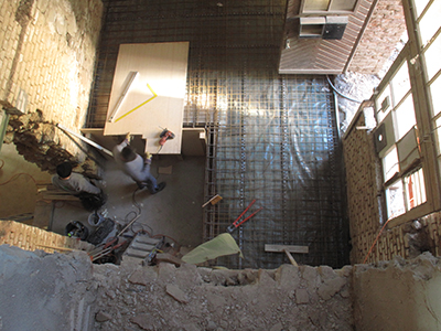 12.02.2019 Mittlerweile sind alle Zwischengeschossdecken aus dem späteren zentralen Treppenhaus entfernt. |