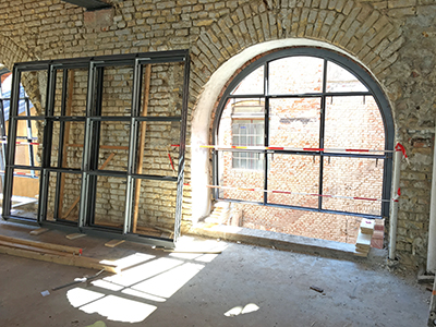 11.04.2019 Einsetzen der großen Bogenfenster im Sudhaus. |