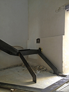 30.04.2019 So beginnt eine Treppe! Die ersten Stahlwangen der komplexen, alle Stockwerke erschließenden Treppe im Turm bzw. Südflügel wurden montiert. |